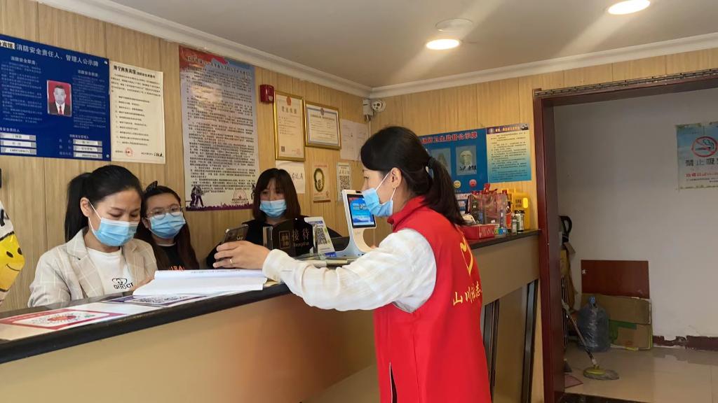2021年8月9日,何敏(右一)在辖区宾馆排查中高风险地区来返人员。(受访者供图)