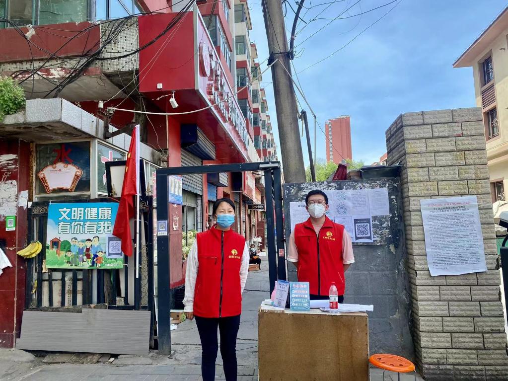 2021年8月7日,何敏(左)和辖区志愿者在小区门口值守。(受访者供图)