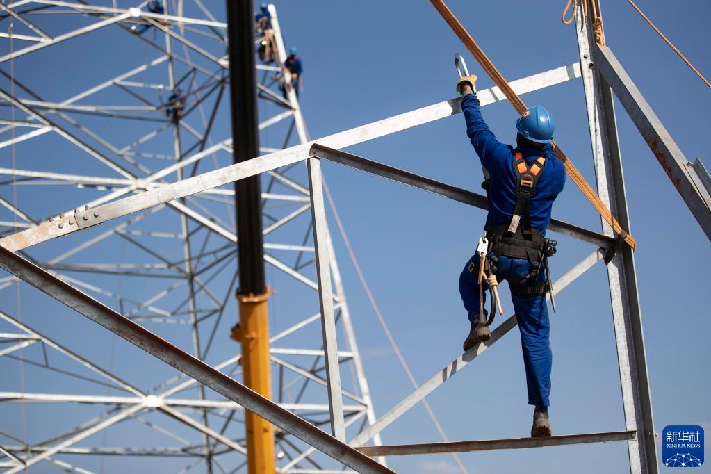 2018年8月7日,在巴西东南部阿科斯市附近,工人在巴西美丽山水电特高压直流送出二期工程项目现场施工。新华社记者 李明 摄