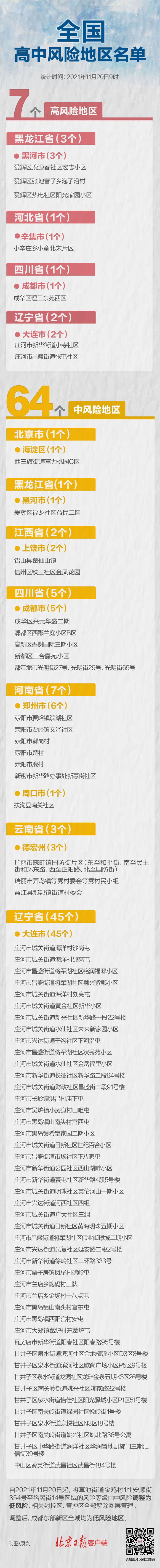 四川成都东部新区新型冠状病毒肺炎疫情防控指挥部发布消息,截至11月20日,成都东部新区草池街道金鸡村1社安顺街354号至裕民街14号已连续14天无新增本土确诊病例,根据省、市专家评估意见和成都市新冠肺炎疫情防控指挥部专业疫情防控组批复,自2021年11月20日起,将草池街道金鸡村1社安顺街354号至裕民街14号区域的风险等级由中风险调整为低风险,相关封控区、管控区全部解除圈层管理。调整后,成都东部新区全域均为低风险地区。