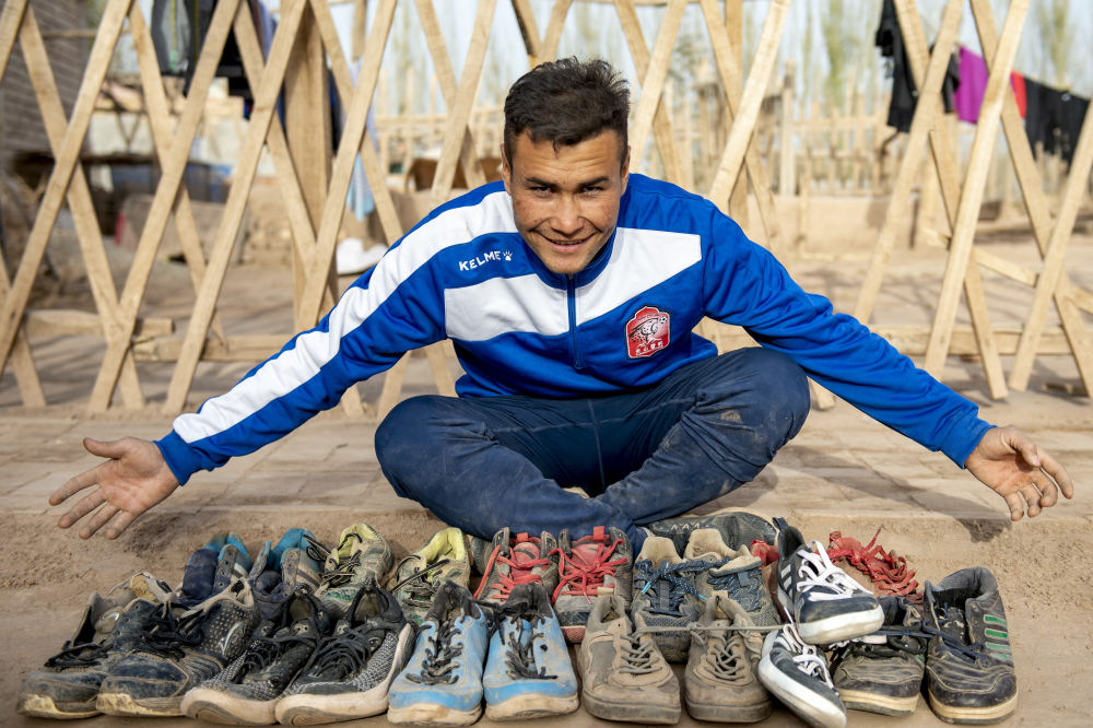 ↑在新疆疏附县萨依巴格乡尤喀克喀帕村,努尔麦麦提在自家院里展示被他踢坏的球鞋(2021年11月13日摄)。新华社记者 马锴 摄