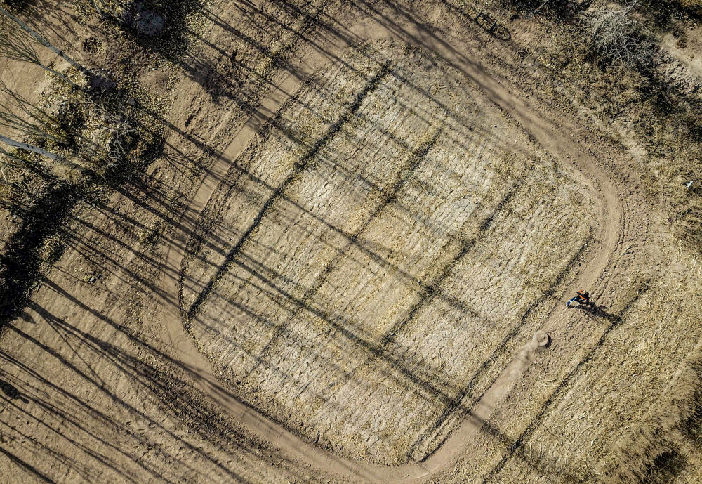 ↑在新疆疏附县萨依巴格乡,努尔麦麦提在自家玉米地里练习拖轮胎跑(2021年11月15日摄,无人机照片)。新华社记者 马锴 摄