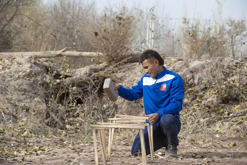 ↑在新疆疏附县萨依巴格乡尤喀克喀帕村,努尔麦麦提在自家玉米地里将木条砸进土里,用于练习折返跑(2021年11月13日摄)。新华社记者 马锴 摄