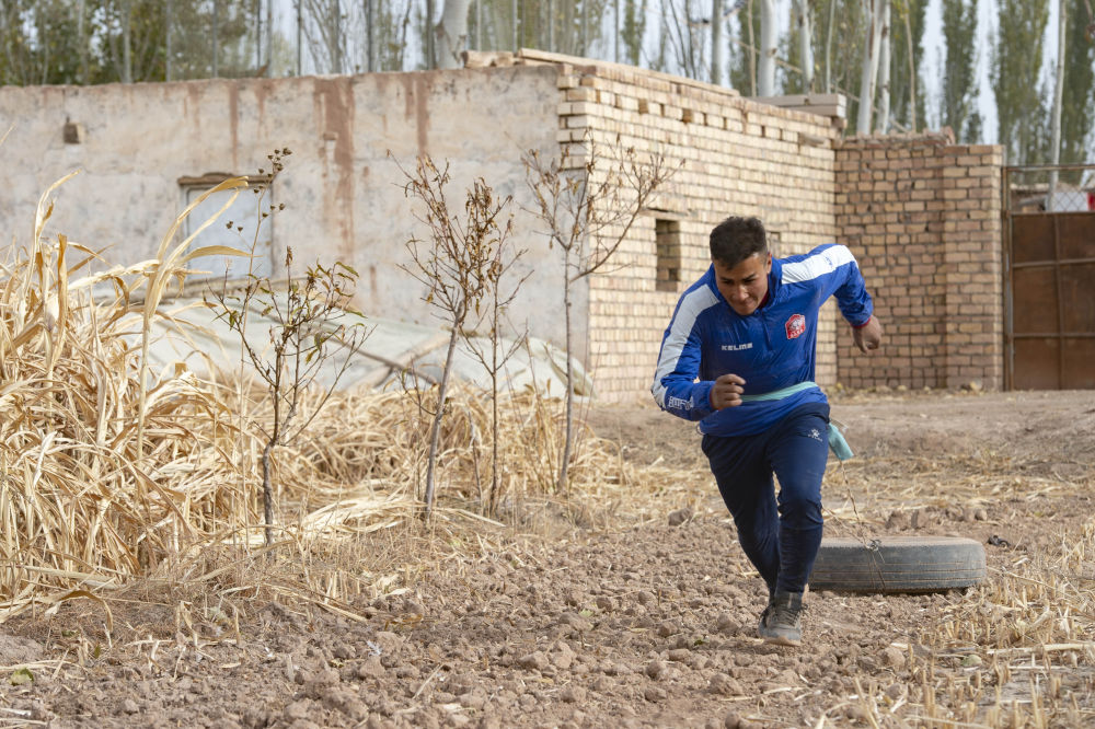 ↑在新疆疏附县萨依巴格乡尤喀克喀帕村,努尔麦麦提在自家院里练习拖轮胎跑(2021年11月10日摄)。新华社记者 马锴 摄