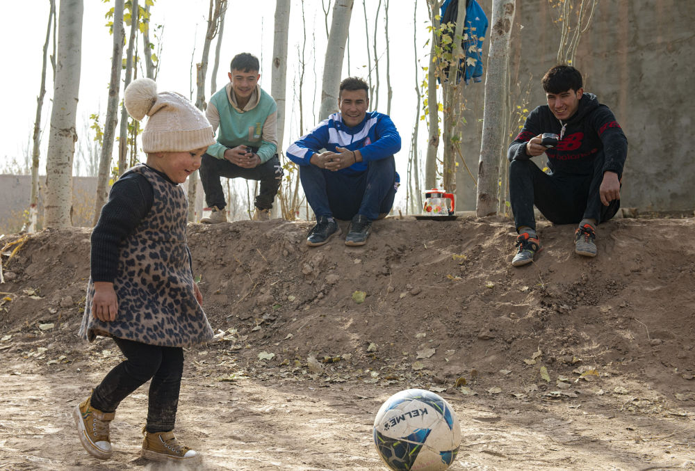 ↑在新疆疏附县萨依巴格乡尤喀克喀帕村,努尔麦麦提(后中)在自家院里看外甥女踢球玩(2021年11月13日摄)。新华社记者 马锴 摄