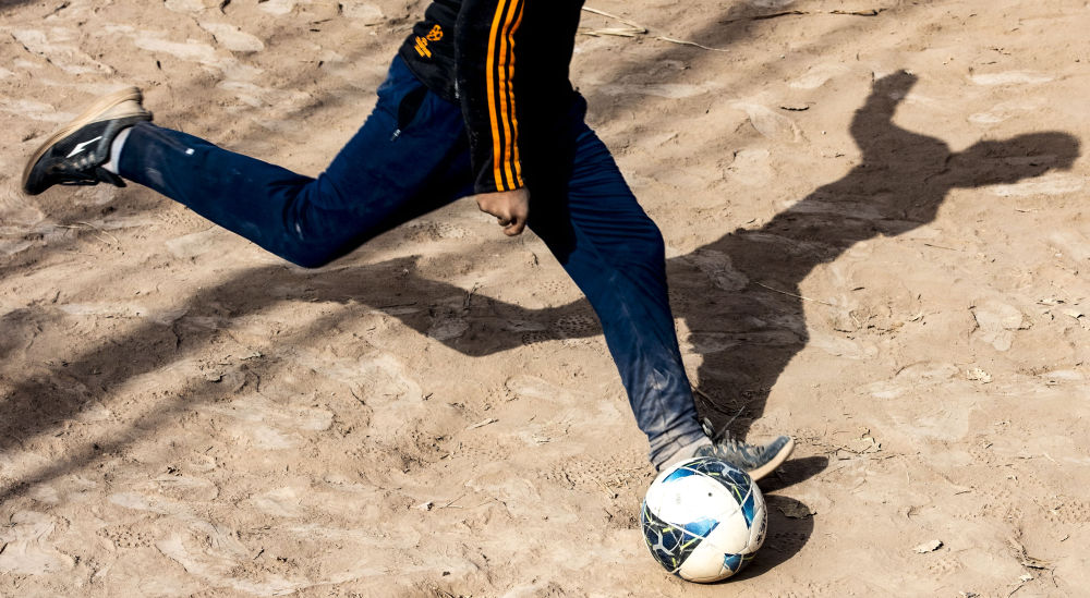↑在新疆疏附县萨依巴格乡尤喀克喀帕村,努尔麦麦提在自家院里练习踢球(2021年11月13日摄)。新华社记者 马锴 摄