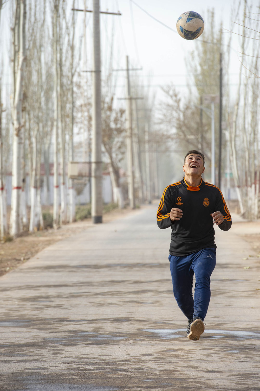 ↑在新疆疏附县萨依巴格乡尤喀克喀帕村,努尔麦麦提在村里的路上练习顶球(2021年11月13日摄)。新华社记者 马锴 摄