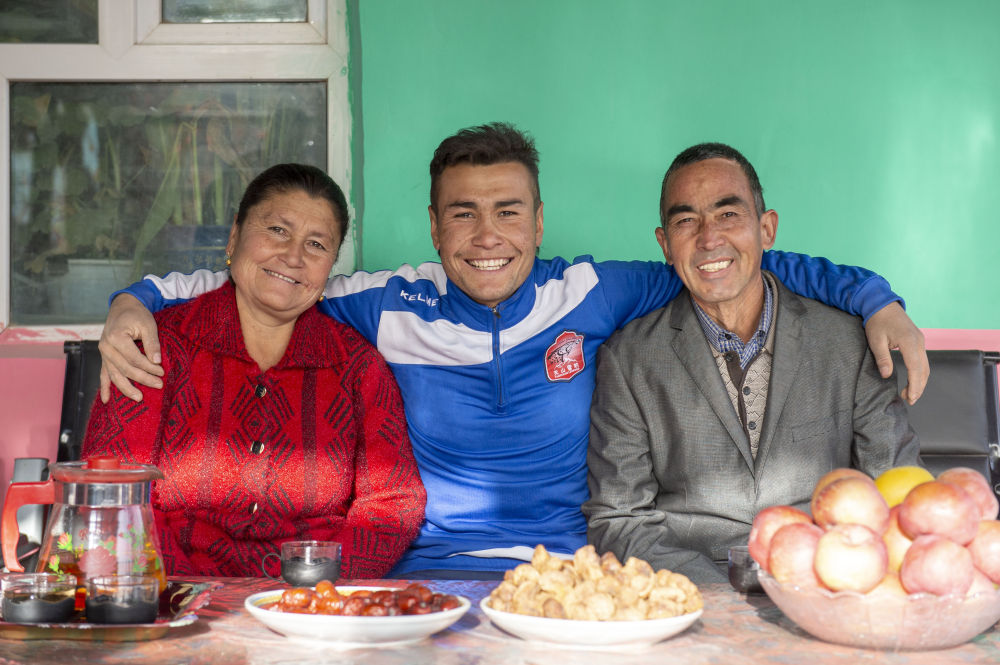↑在新疆疏附县萨依巴格乡尤喀克喀帕村,努尔麦麦提和父母在家中合影(2021年11月13日摄)。努尔麦麦提妈妈身穿的红毛衣,是努尔麦麦提用自己第一个月的球员工资买给妈妈的礼物。新华社记者 马锴 摄