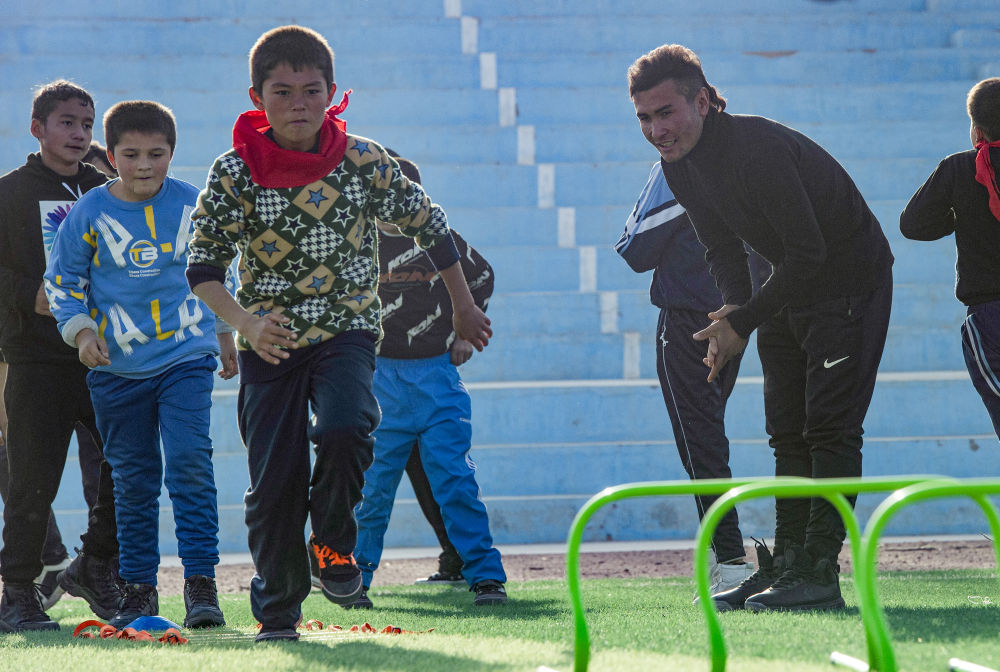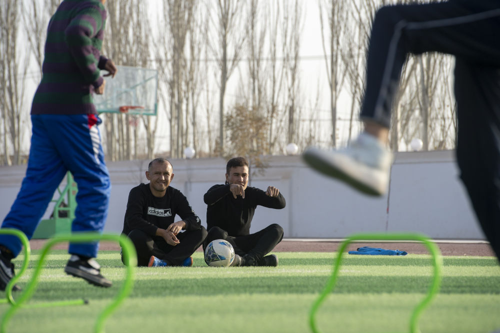 ↑在新疆疏附县萨依巴格乡中心小学的足球场上,努尔麦麦提(后右)和自己儿时的教练麦合木提江·托合提一起指导孩子们训练(2021年11月15日摄)。新华社记者 马锴 摄