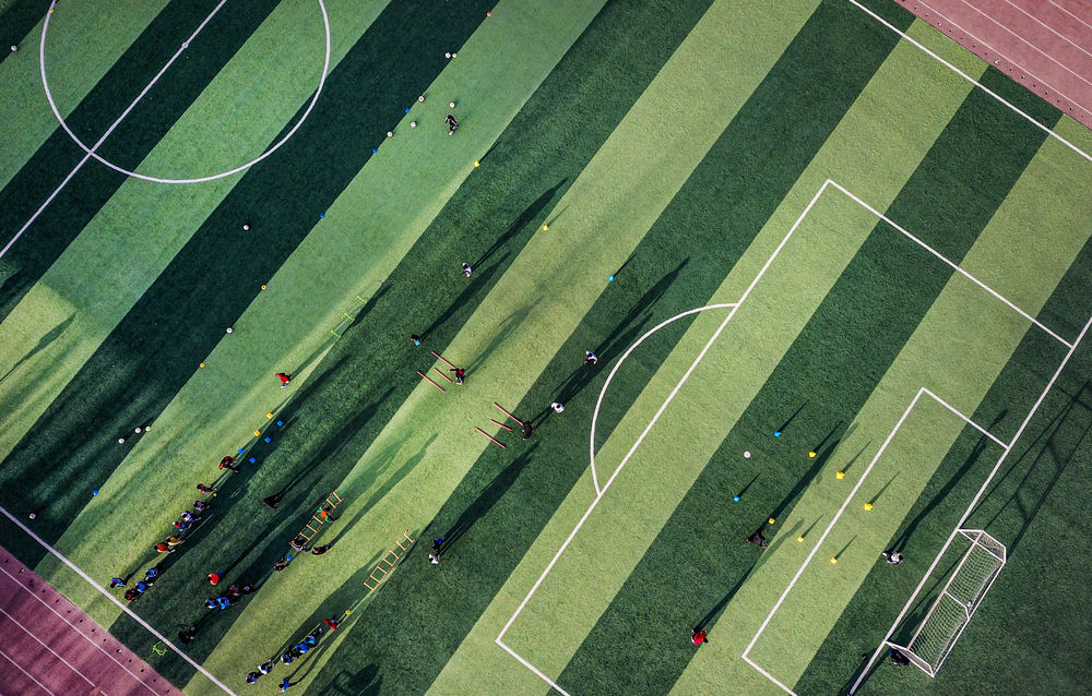 ↑在新疆疏附县萨依巴格乡中心小学的足球场上,努尔麦麦提和孩子们一起训练(2021年11月15日摄,无人机照片)。新华社记者 马锴 摄