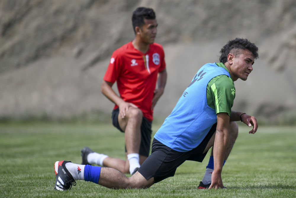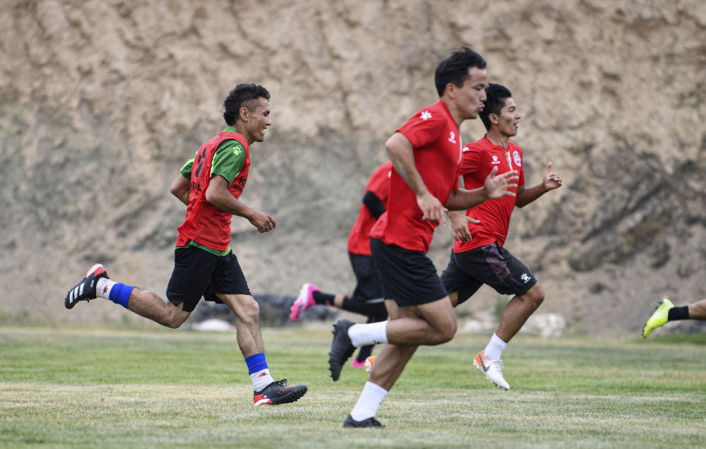 ↑在新疆天山雪豹足球队的训练场上,努尔麦麦提(右)参加试训(2020年6月19日摄)。新华社记者 王菲 摄