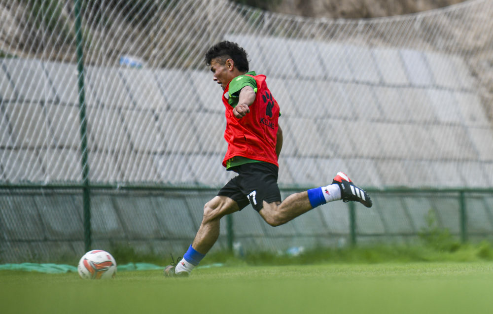 ↑在新疆天山雪豹足球队的训练场上,努尔麦麦提参加试训(2020年6月19日摄)。新华社记者 王菲 摄