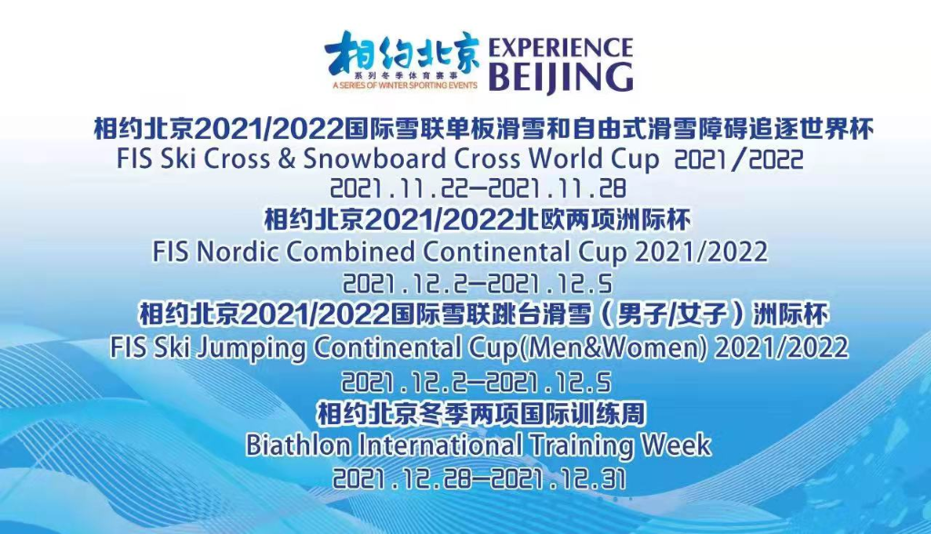 按北京冬奥组委安排,11月至12月,张家口赛区将举办4场测试活动,分别是:2021-2022国际雪联单板滑雪和自由式滑雪障碍追逐世界杯,2021-2022国际雪联北欧两项洲际杯,2021-2022国际雪联跳台滑雪洲际杯,冬季两项国际训练周。