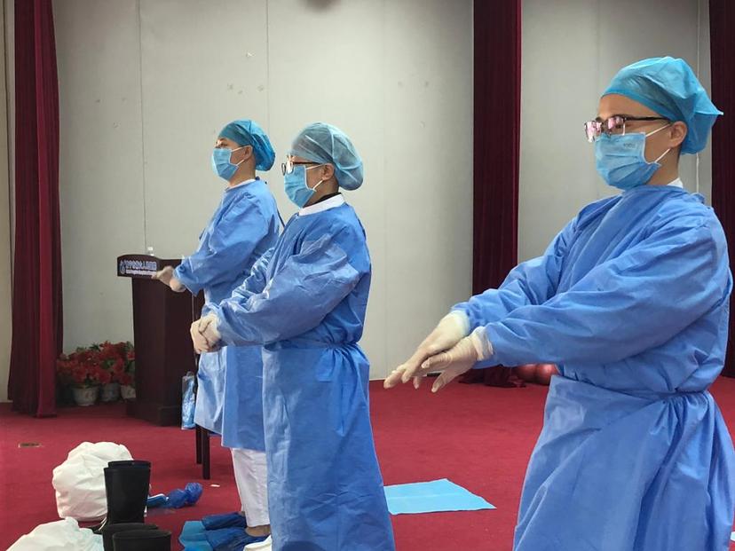 梁小霞(右一)出征前与队友进行穿脱防护服训练。图片由南宁市第六人民医院提供