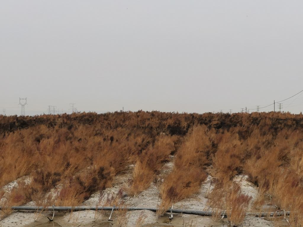 11月的“油城”克拉玛依,科研人员顶着寒风,在城郊一片长满深红色植物的试验田里采集一种名叫盐地碱蓬的植物种子。茂密的盐地碱蓬紧挨着一片光秃秃的土地,地表遍布着白色斑块。