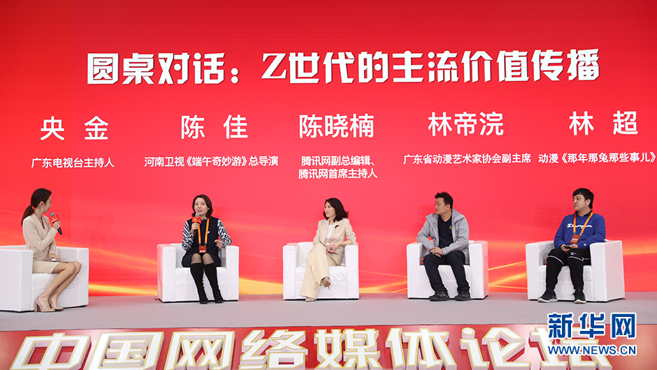 由新华网承办的2021中国网络媒体论坛内容论坛于11月24日在广州举行,各界嘉宾围绕“传播:塑造价值”展开探讨和交流。图为圆桌对话二:Z世代的主流价值传播。新华网 陈杰摄