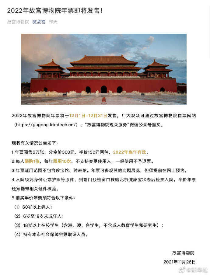 记者从故宫博物院获悉,2022年故宫博物院年票将于12月1日至12月31日发售,广大观众可通过故宫博物院售票网站、“故宫博物院观众服务”微信公众号购买。年票限售5万张,分全价300元、半价150元两种,2022年当年有效。每人限购1张,每年限用10次。(记者施雨岑)