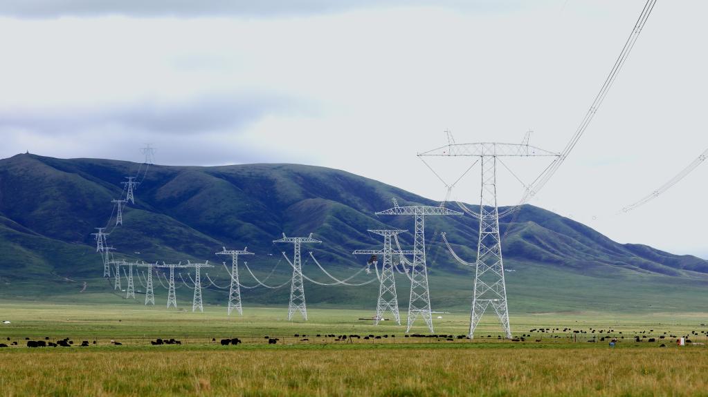 6月17日在青海省黄南藏族自治州河南蒙古族自治县拍摄的青豫特高压直流工程。新华社发(谢莉蓉 摄)