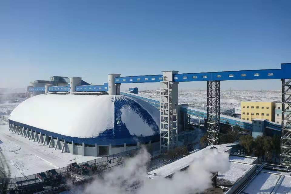 雪后羊场湾煤矿储煤仓(无人机拍摄,受访者供图)