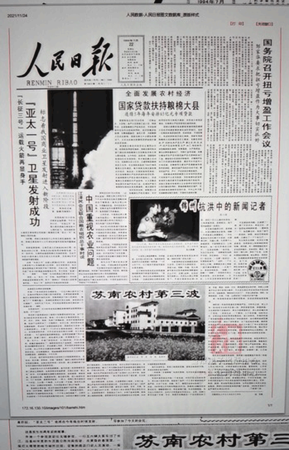 1994年刊登新华社通稿《苏南农村第三波》的人民日报版面。