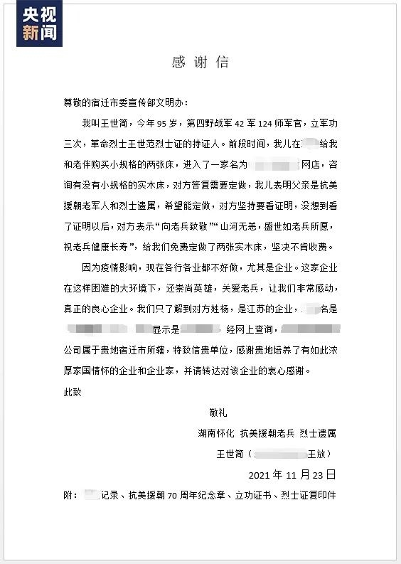 近日,江苏宿迁一位家具网店店主得知买家是一位抗美援朝老战士,当即作出一个决定——只送不卖!此后发生的一系列故事更让网友直呼“太暖心了”。