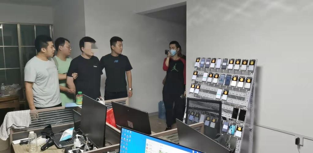 办案民警送犯罪嫌疑人指认现场,这里有大量手机放在铁架上面进行自动注册微信号。(受访单位供图)