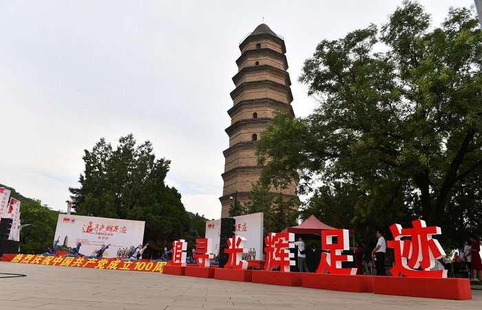 8月4日,在陕西延安的宝塔山下,扶贫干部、革命讲解员声情并茂讲述延安人民坚持用延安精神建设延安、发展延安的奋斗历程。