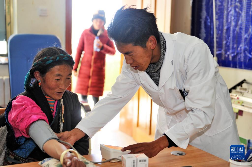 图为全科医生旺扎在为一名农牧民测量血压(2018年1月14日摄)。新华社记者张汝锋 摄