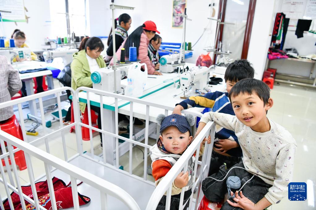 在贵州省威宁县五里岗街道朝阳新城易地扶贫搬迁安置小区,搬迁户在就业扶贫手工车间可以一边就业,一边带孩子(11月28日摄)。新华社记者 杨文斌 摄