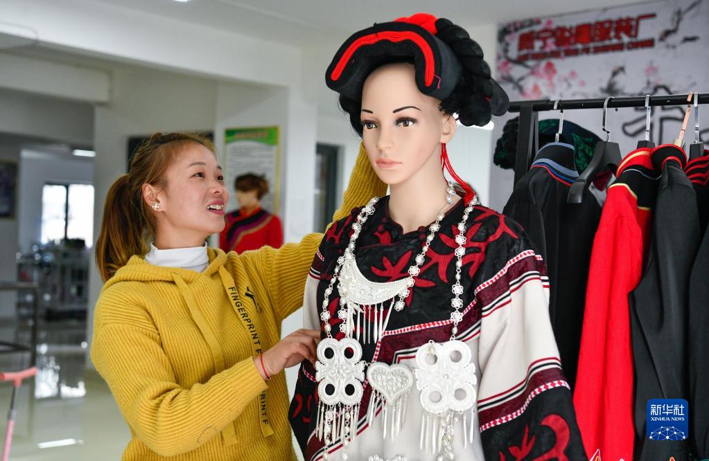 在贵州省威宁县五里岗街道朝阳新城易地扶贫搬迁安置小区,搬迁户在就业扶贫手工车间整理缝制完毕的民族服饰(11月28日摄)。新华社记者 杨文斌 摄