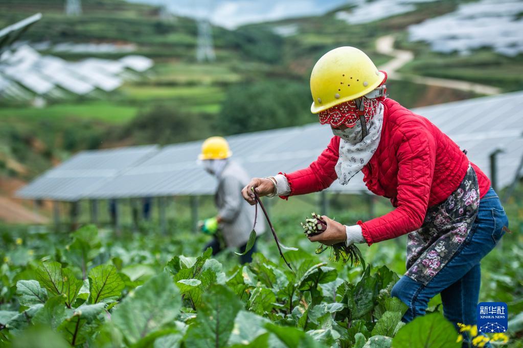 贵州省威宁县村民在仙水窝光伏电站采摘红菜苔(8月24日摄)。新华社记者 陶亮 摄