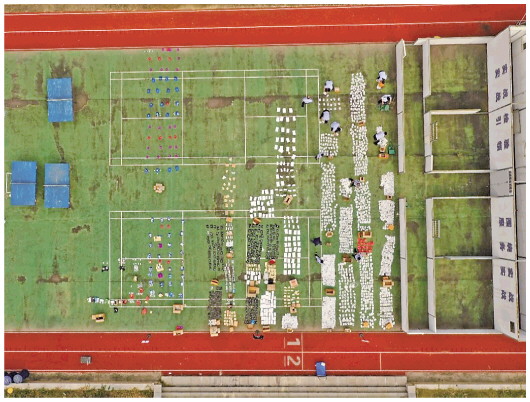 安徽省含山县公安局在“11·18”特大妨害信用卡管理案查获的银行卡“四件套”铺满半个操场。含山县公安局供图