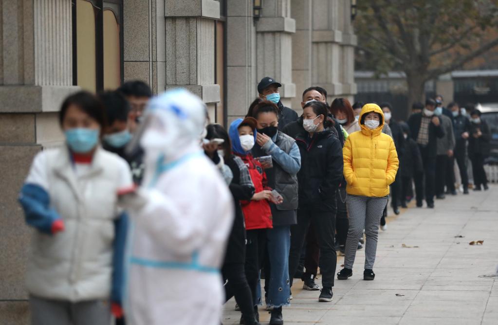 11月17日,大连市玉华社区居民在核酸检测点外排队等候核酸采样。新华社记者姚剑锋 摄