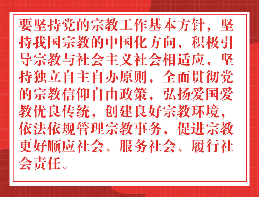 12月3日至4日,全国宗教工作会议在北京召开。中共中央总书记、国家主席、中央军委主席习近平出席会议并发表重要讲话。李克强、栗战书、汪洋、王沪宁、赵乐际、韩正出席会议。