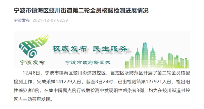 12月8日,宁波市镇海区蛟川街道封控区、管控区及防范区开展了第二轮全员核酸检测工作,完成采样141229人份。截至8日24时,已出检测结果127921人份,检出阳性感染者8例,在集中隔离点例行核酸检测中发现阳性感染者3例,均为在蛟川街道封控区内主动筛查发现。