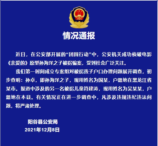 近日,在公安部开展的“团圆行动”中,公安机关成功侦破电影《亲爱的》原型孙海洋之子被拐骗案,受到社会广泛关注。