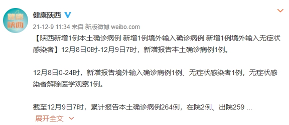 【陕西新增1例本土确诊病例 新增1例境外输入确诊病例 新增1例境外输入无症状感染者】12月8日0时-12月9日7时,新增报告本土确诊病例1例。