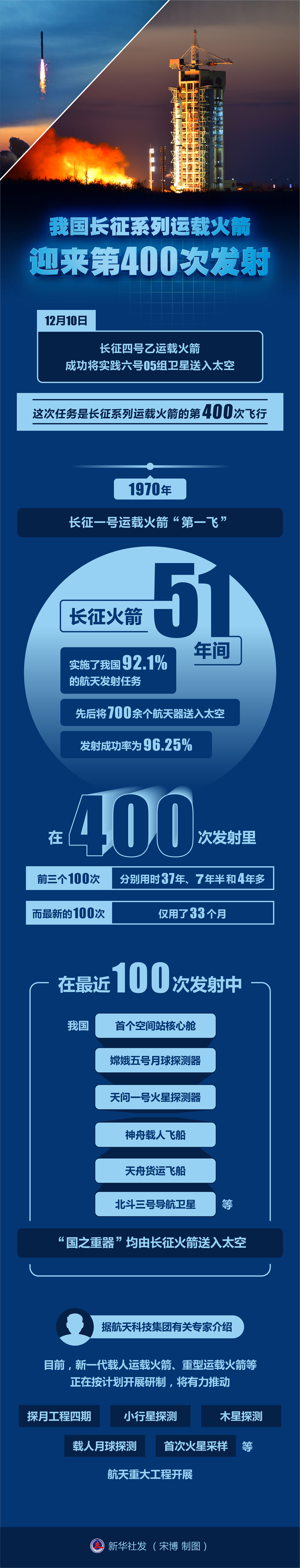 从1970年长征一号运载火箭“第一飞”至今,长征火箭51年间实施了我国92.1%的航天发射任务,先后将700余个航天器送入太空,发射成功率为96.25%。在400次发射里,前三个100次分别用时37年、7年半和4年多,而最新的100次从2019年3月10日至今,仅用了33个月。
