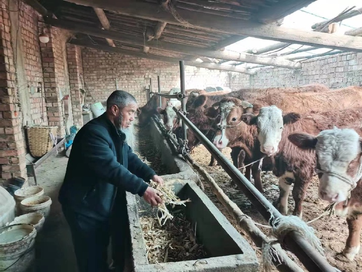 马一洒给在牛圈中给牛喂食草料。(受访者供图)