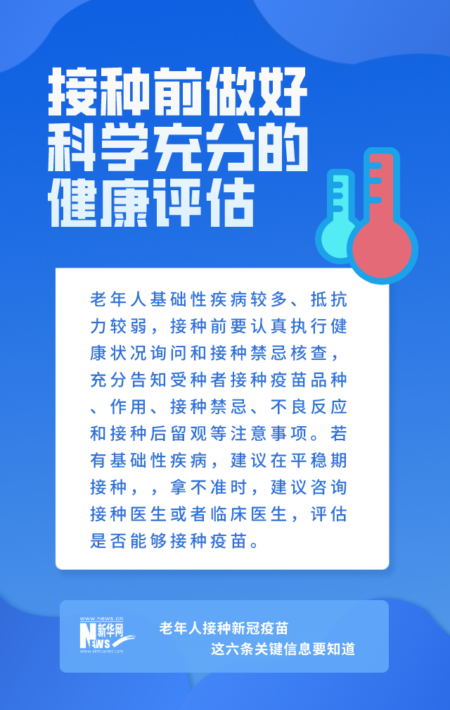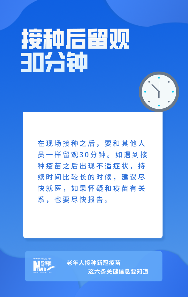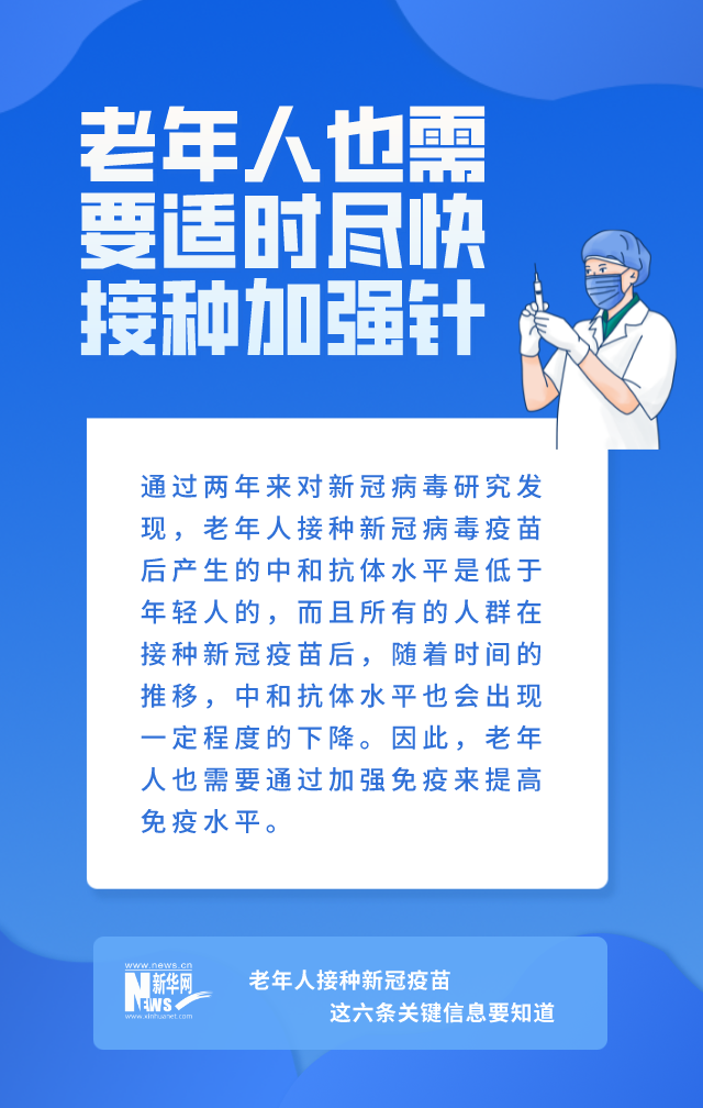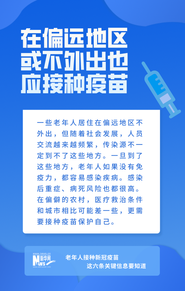 目前,我国各地正在推进老年人新冠病毒疫苗接种工作。老年人接种疫苗的保护效力如何?接种时要重点关注哪些事项?要不要接种加强针?偏远地区的老年人是不是可以不接种?跟随国务院联防联控机制新闻发布会内容,一起了解老年人接种疫苗的六条关键信息。