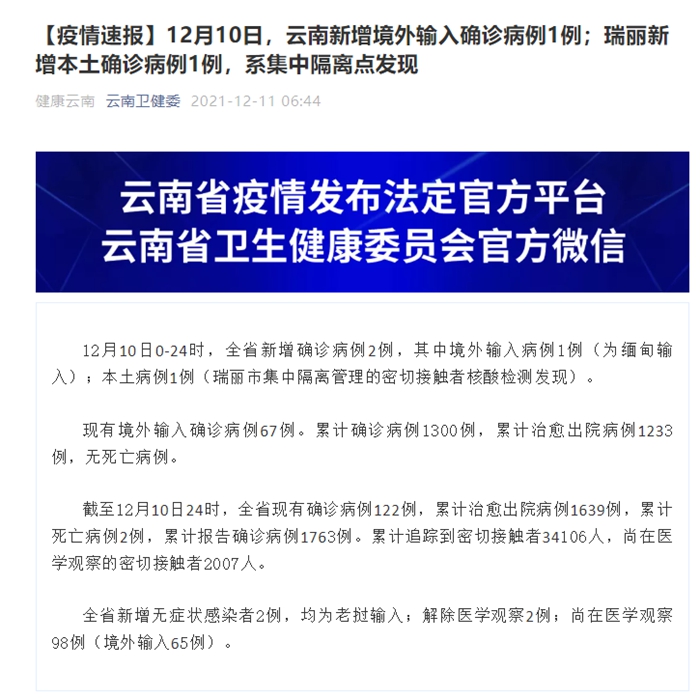 12月10日,云南新增境外输入确诊病例1例;瑞丽新增本土确诊病例1例,系集中隔离点发现