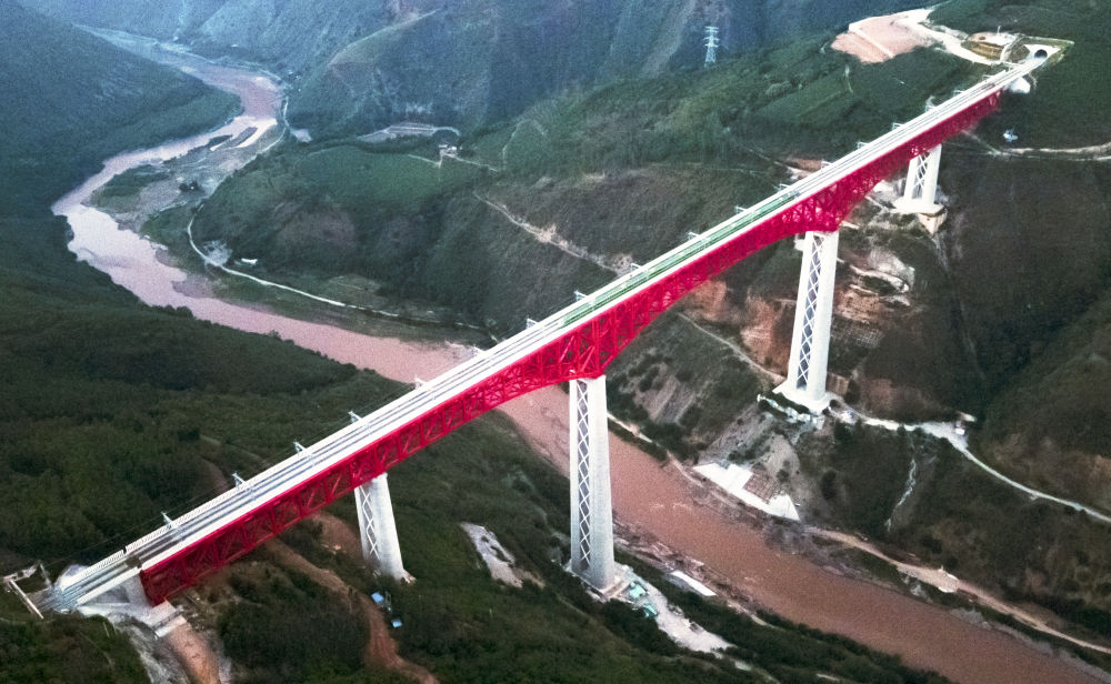 ↑ 2021年12月3日,中老铁路首发列车驶过云南省境内的元江双线特大桥。