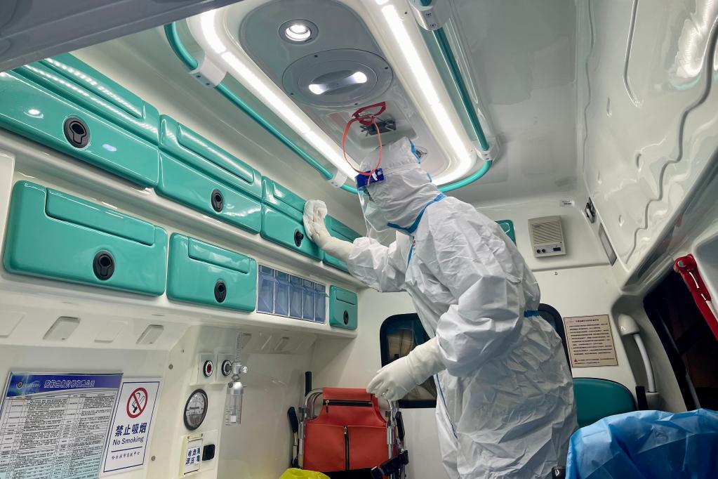 12月5日,哈尔滨市急救中心工作人员对负压急救车进行消毒。(受访者供图)