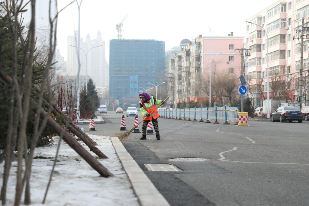 疫情期间,在哈尔滨市香坊区,环卫工人正在清扫街道。(新华社记者侯鸣 摄)