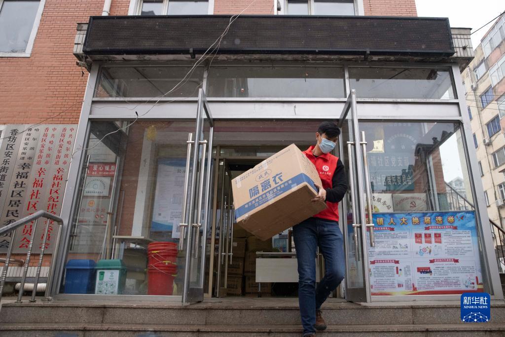 12月10日,在哈尔滨市香坊区安乐街道办事处,关超在搬运防疫物资。新华社记者 张涛 摄