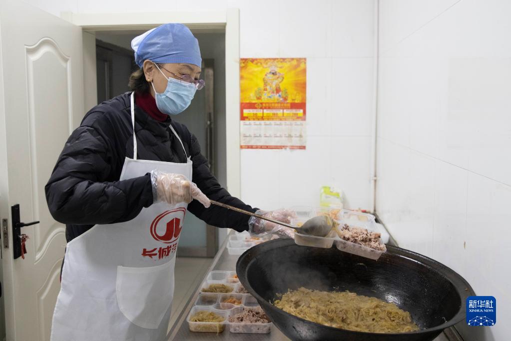 12月10日,在哈尔滨市香坊区安乐街道办事处,王涛为社区工作人员准备盒饭。新华社记者 张涛 摄