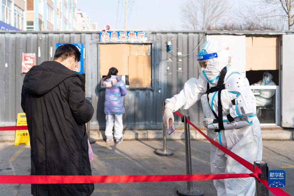 12月9日,在哈尔滨市松北区裕民街道志华社区一核酸检测点,李松竹(右)引导居民进行信息采集。新华社记者 谢剑飞 摄
