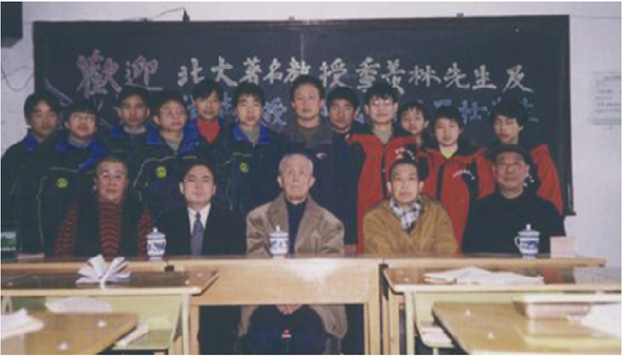 1999年寒假,学院名誉校长季羡林先生(中)为灾区同学们开展爱国主义教育的讲座,他勉励同学们要爱国、拼搏、努力成为时代的优秀学子,要感恩党和政府及社会给他们带去的温暖。杨波校长(左二)、李玉洁老师(左一)、著名画家王乃壮先生(右二)、学院副校长程贞益同志陪同。