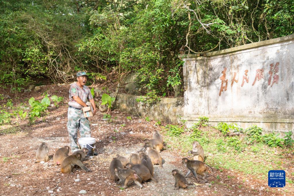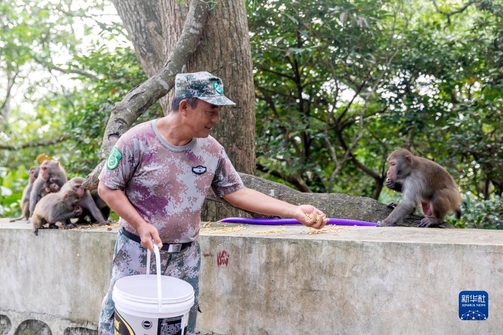 护林员兼猕猴保育员刘清伟在喂养野生猕猴(6月10日摄)。新华社发
