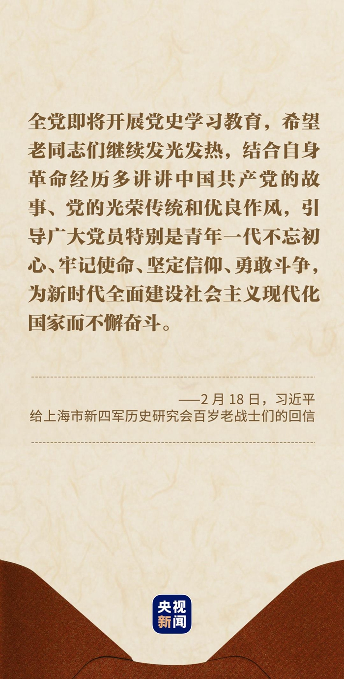 习近平总书记在回信中说:“你们青年时代就投身革命,为党和人民事业英勇奋斗,期颐之年仍心系党史宣传教育,深厚的爱党之情令人感佩。”